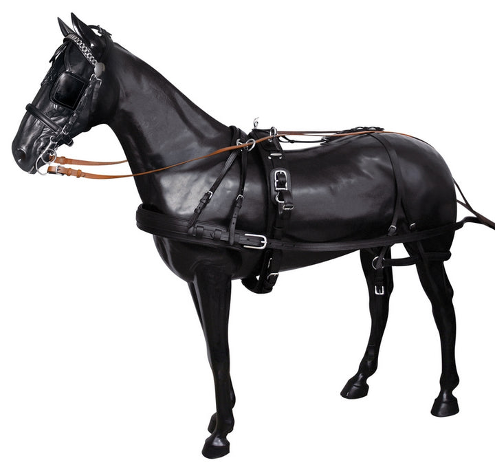 Finimento da carrozza modello Diplomat, in cuoio con rinforzi in nylon, misura full e cob, colore nero con redini in cuoio rossiccio e colore rossiccio con redini in tinta.
