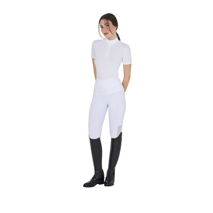 Polo da donna in tessuto tecnico traspirante, ideale per mantenere la temperatura corporea ottimale anche durante gli allenamenti più intensi. Il design aderente e dinamico esalta una femminilità moderna, combinando prestazioni avanzate e versatilità. Perfetta sia per look sportivi che fashion, questa polo offre infinite opzioni. La zip frontale a 3/4 non solo facilita l'uso ma aggiunge un tocco di carattere al capo. Il vero protagonista è il colletto decorato con perline, che impreziosisce l'outfit con un dettaglio elegante e glamour, elevando il classico abbigliamento sportivo.