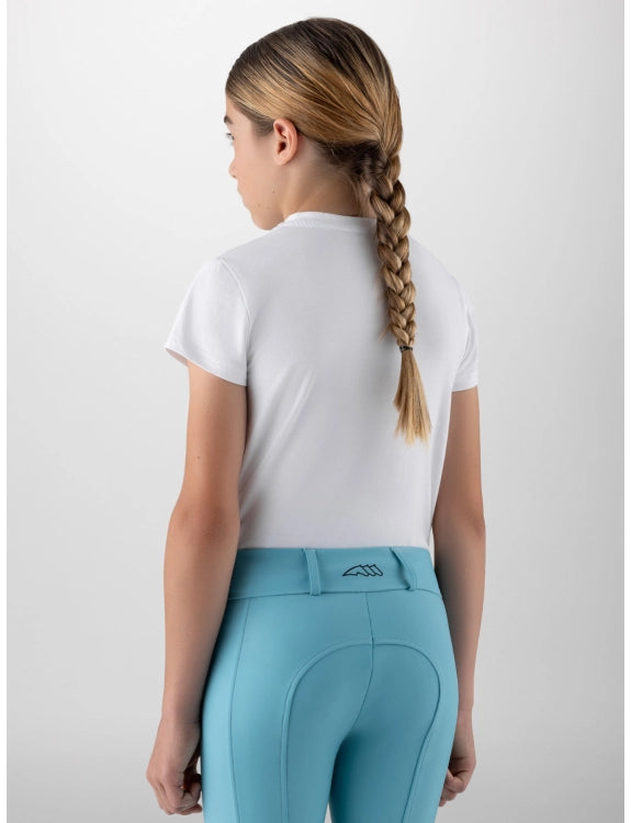 Fai risplendere la tua giovane amazzone con questa T-shirt da bambina. Realizzata in tessuto morbido e traspirante, questa t-shirt garantisce comfort per tutto il giorno per qualsiasi attività. Decorata con un leggero logo di strass color acquamarina sul petto, aggiunge un tocco di brillantezza ed eleganza al suo outfit. Progettata con un classico girocollo, offre un look senza tempo adatto sia per le uscite casual che per le lezioni di equitazione.